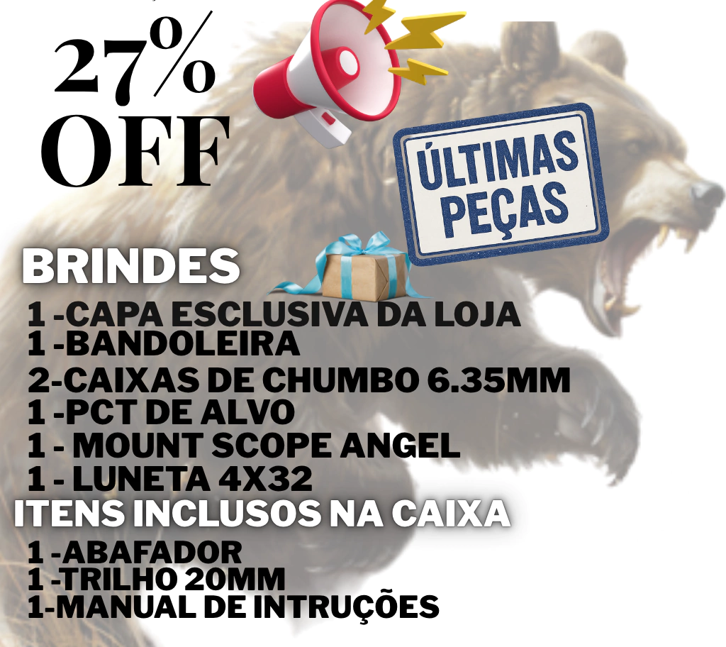 O calibre 6.35mm é ideal para quem deseja alto poder de impacto e ótima performance em tiros de média e longa distância. Sua coronha em madeira de alta resistência é anatômica, garantindo conforto e firmeza durante o uso, enquanto o cano de aço estriado proporciona agrupamentos mais precisos.